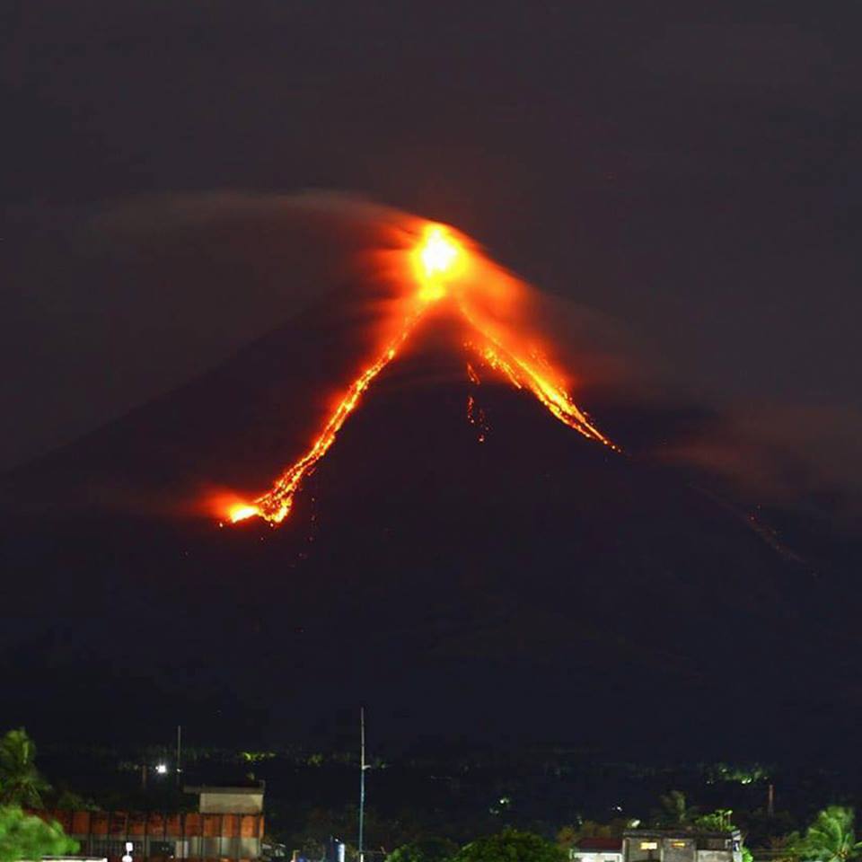 Mayon Volcano erupts, glowing red lava out from its crater. Mount Mayon spews huge ash clouds in Legazpi City, Albay, Philippines